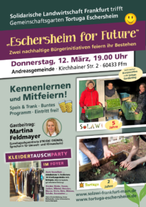 Unter dem Motto „Eschersheim for Future“ laden der Gemeinschaftsgarten Tortuga und die SoLaWi Frankfurt am 12. März ab 19:00 in den Saal der Andreasgemeinde (Kirchhainer Str. 2) zu einem bunten Abend. Es wird einen Gastbeitrag der hessischen Landtagsabgeordneten Martina Feldmayer geben sowie eine Kleidertauschparty im Foyer.