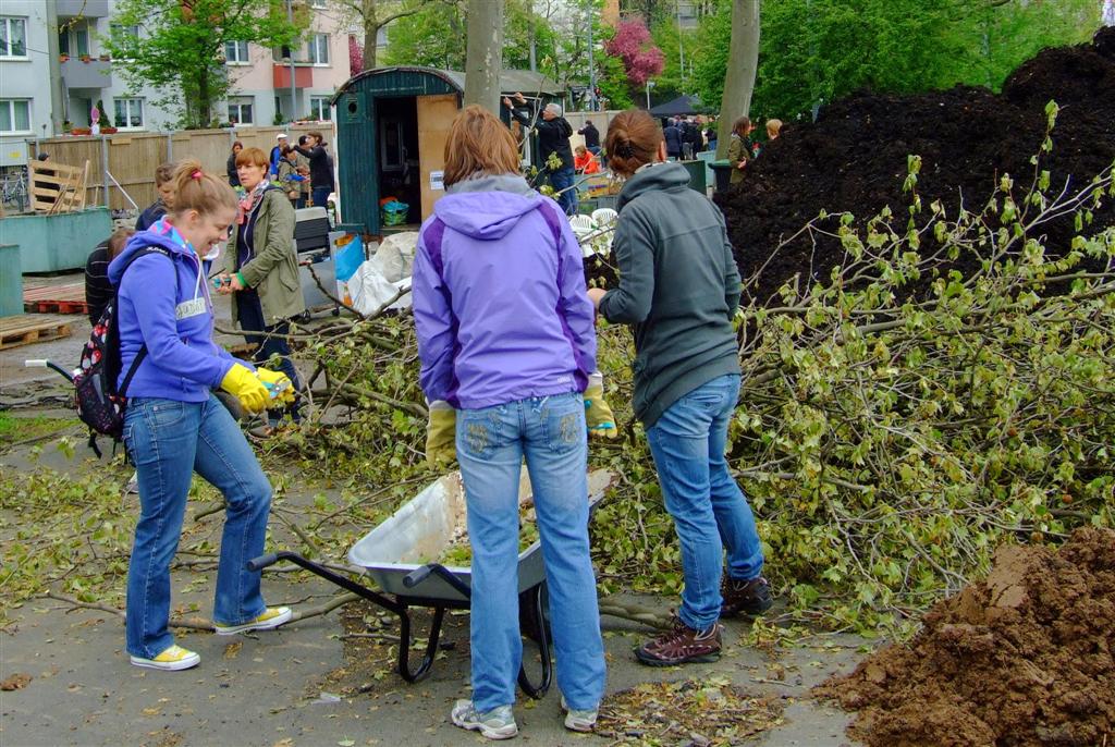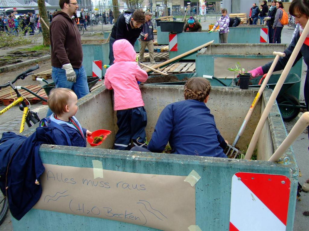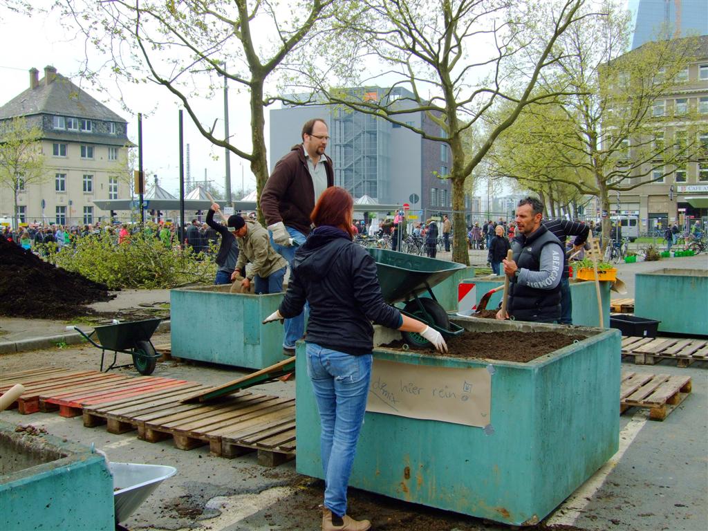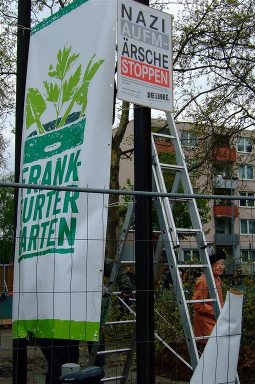 Am Mittwoch war es soweit: Der Frankfurter Garten – erstes größeres Urban Gardening-Projekt im Stadtgebiet – öffnete seine Pforte für alle Gemeinschaftsgärtner und interessierten Besucher. In den nächsten Monaten soll der Danziger Platz vor dem Ostbahnhof mit mobilen Pflanzgefäßen und vielen freiwilligen Helfern in einen Ort der Begegnung im bislang eher tristen Frankfurter Ostend verwandelt werden. Dass der Auftakt am 1. Mai ein Erfolg wurde, verdanken die Initiatoren des Projekts auch ihrem Mut, sich nicht von dem für denselben Tag angekündigten Naziaufmarsch in der Nähe des Geländes abhalten zu lassen. Vor Ort führte das zu der grotesk anmutenden Situation, dass im umzäunten Innenraum die ersten Poller in Hochbeete verwandelt, Bauwagen und Container verschönert und Pflanzkisten gezimmert wurden, während nur wenige Meter entfernt die Demonstranten unter Polizeiaufsicht ausharrten, um den Rechten nicht das Feld für ihren Aufmarsch zu überlassen.